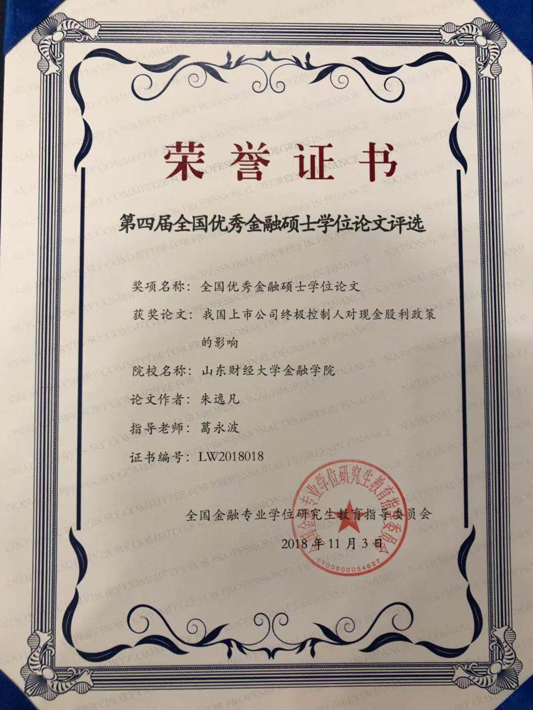 由全国金融专业学位研究生教育指导委员会主办的2018年全国金融专业学位研究生教育工作会议于11月3日在北京召开。本次大会公布了第四届全国优秀金融硕士学位论文评选结果并举行了颁奖仪式,共有19篇论文获奖。我校金融学院葛永波教授指导的硕士研究生朱逸凡撰写的毕业论文《我国上市公司终极控制人对现金股利政策的影响》在众多参评成果中脱颖而出,喜获全国优秀金融硕士学位论文奖。