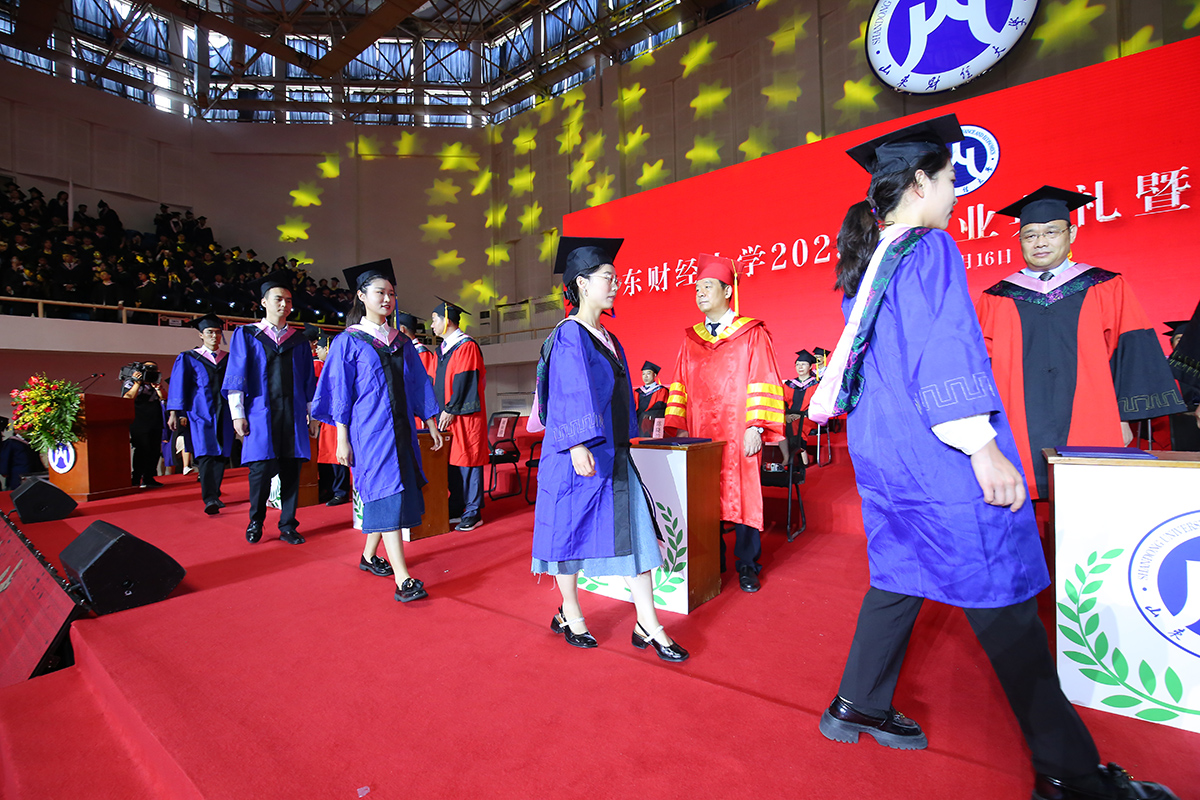 王邵军指出,过去的四年是学校扎实推进高质量发展、办学实力持续提升的关键时期;学校入选了山东省高水平大学建设名单,连续三年在具有博士学位授予权的省属I类高校年度考核中获“优秀”等级,社会声誉和影响力持续攀升;同学们亲历了学校建校70周年和合并建校十周年的隆重庆典。学校全力推进新财经教育教学改革,获批国家级一流本科专业29个、国家级一流本科课程33门,在刚刚公布的第二批国家级一流本科课程中,总量位居省属高校及全国财经类院校第一、全国高校第46位;在全国“互联网+”“挑战杯”“创青春”等高水平竞赛中屡获嘉奖;3个学科入选山东省高峰学科和高水平学科建设名单,应用经济学连续三年进入软科“中国最好学科”排名前10%,学科实力整体稳居全国财经高校前十;学校立足百年学府,悦纳英才,办学条件持续优化,主校区图书馆拔地而起。每一位毕业生都是参与者和见证者!