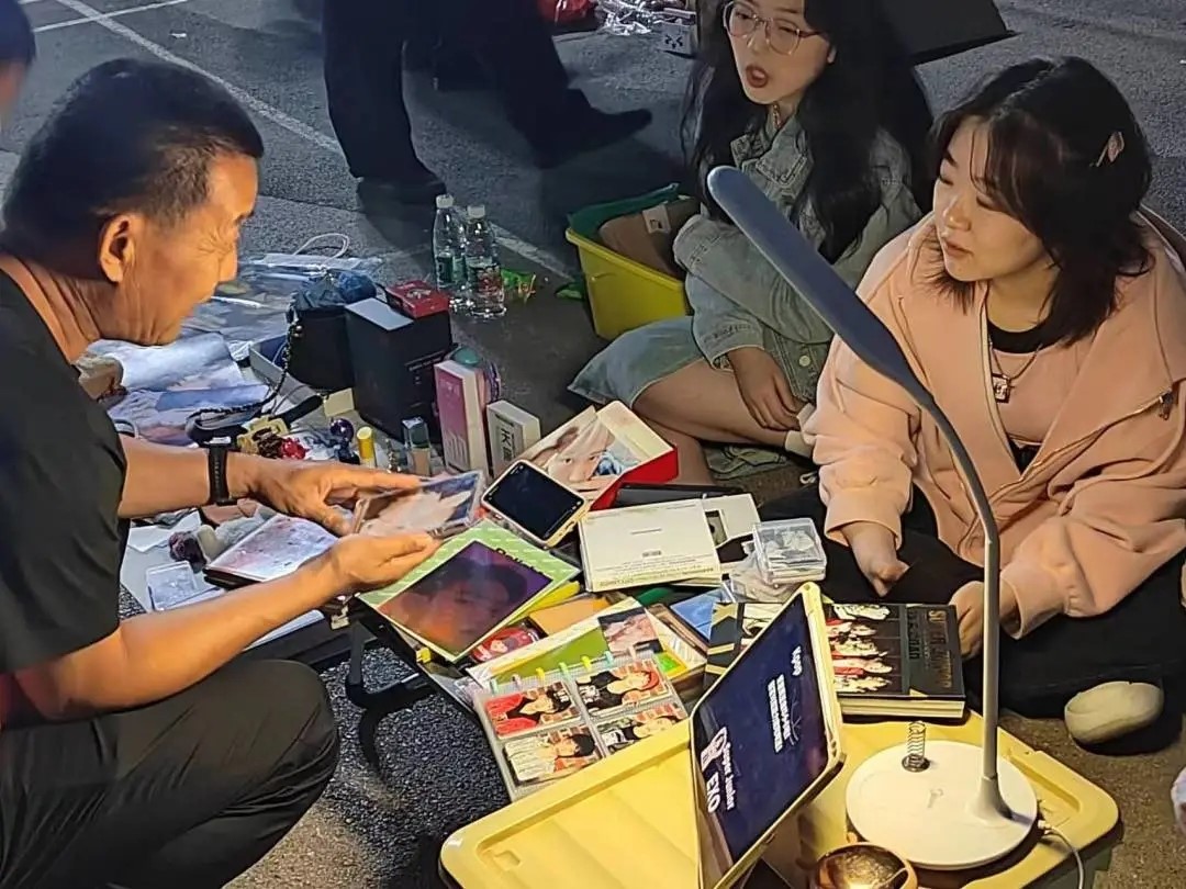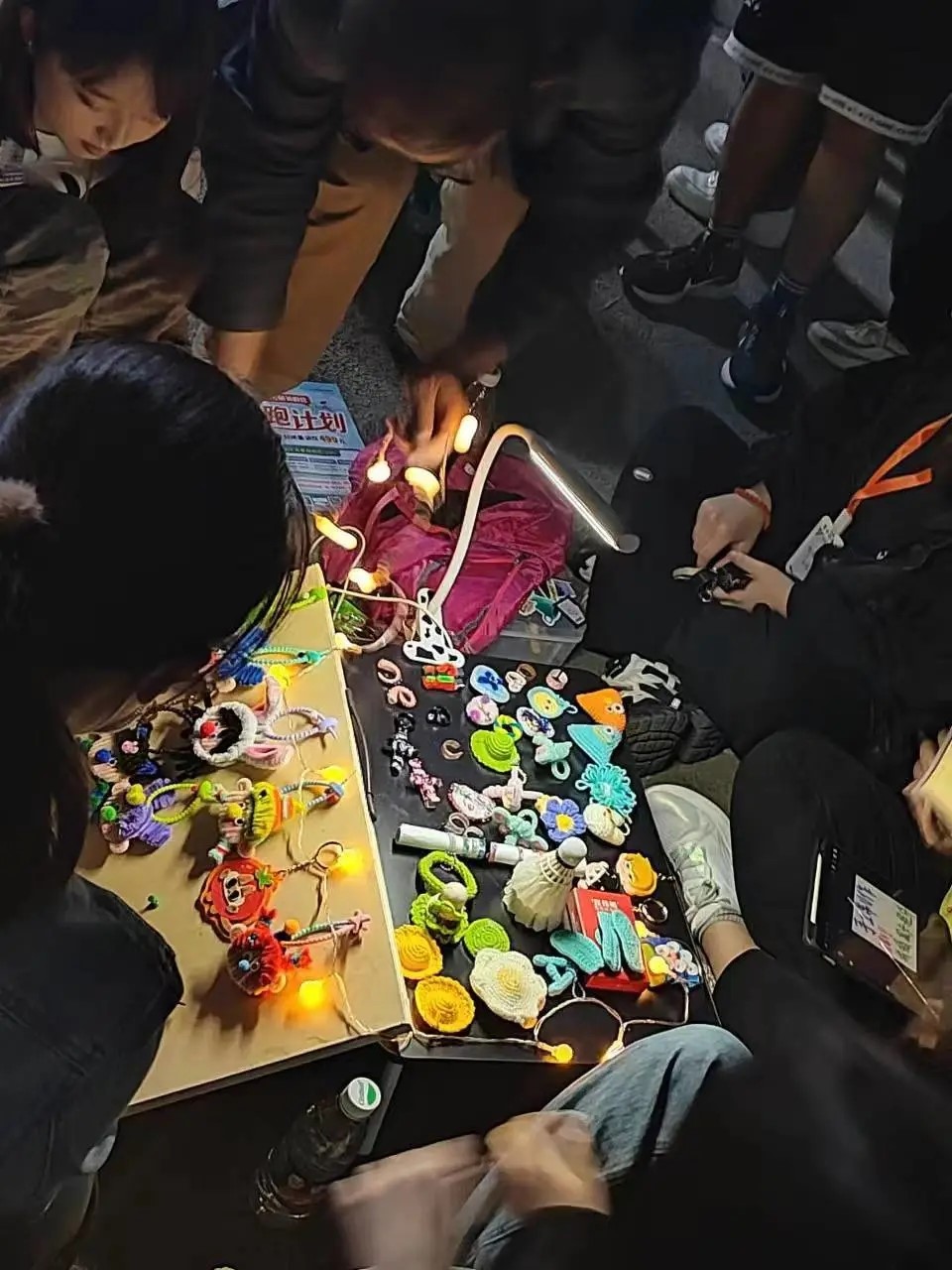 路灯燃起,摊位亮起星星点点的灯光,打在学长学姐的“宝物”上,此刻的旧物都变得闪闪发光。