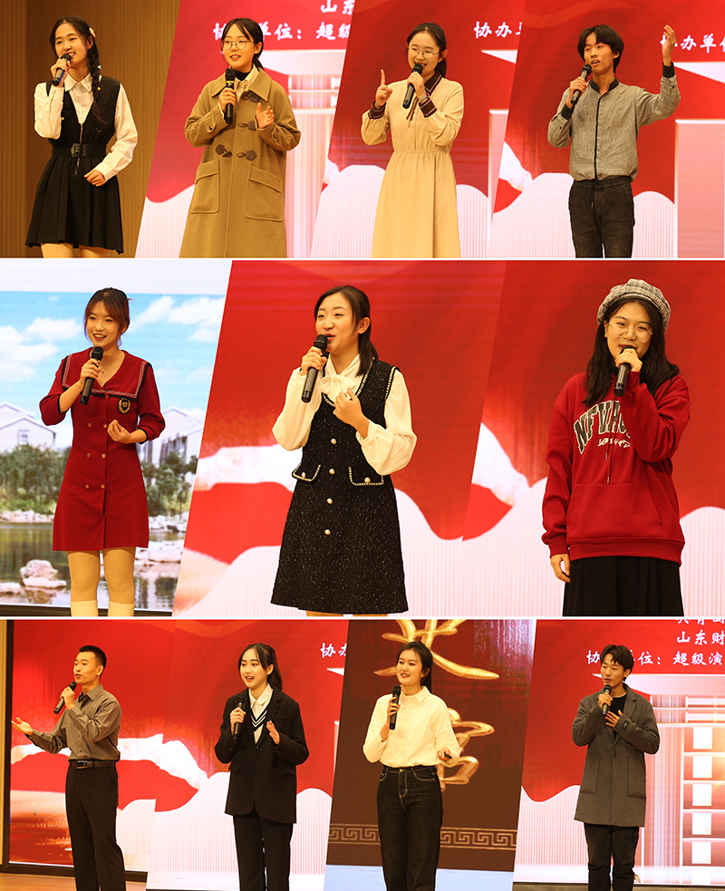 活动中,来自10个学院的11位选手依次登台演讲。对2021级新生而言,大学生活就像是一张崭新白纸,等待他们去勾勒、去描绘,郭佳佳、齐梦晗透过迎新报到、军训汇演和班级点滴故事,分享她们和财大校园的初次相遇;张学毓讲述了和父亲成为校友的财大情节,让财大校风在校友之家悄然传承;程曦文在财大找到家的温暖,收获了勇气,收获了合作,懂得了努力与奋斗。美丽的财大校园,见证了无数财大学子最美好的青春和成长,苏慧怡、李楚云、王琴智用善于发现美的眼睛,分享了自己和山东财大之间的校园浪漫和温馨瞬间;张宜人、侯沅青回忆奋斗拼搏的那些事,分享了校园带给他们的成长与改变,展现出财大青年学子勇于突破自我、探索未知的蓬勃朝气;校史馆讲解员陈熙和公益社团志愿者郑子豪,结合活动经历,将成长路上的沿途风景娓娓道来,传递了财大青年学子对学校的热爱与感激。