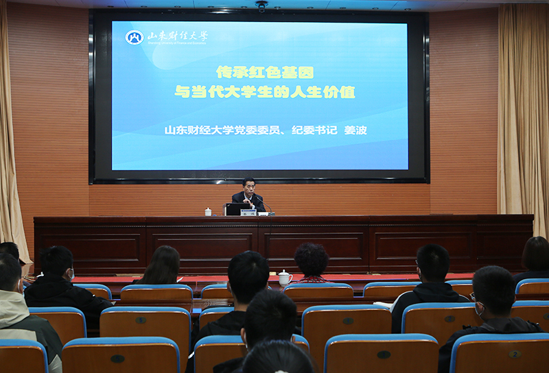 11月12日下午,校纪委书记、山东省监察委员会驻山东财经大学监察专员姜波在燕山校区图书馆报告厅给新生代表上思政课。来自法学院、计算机科学与技术学院、艺术学院的本科生和会计学院的研究生代表180多人聆听了讲课。