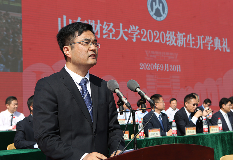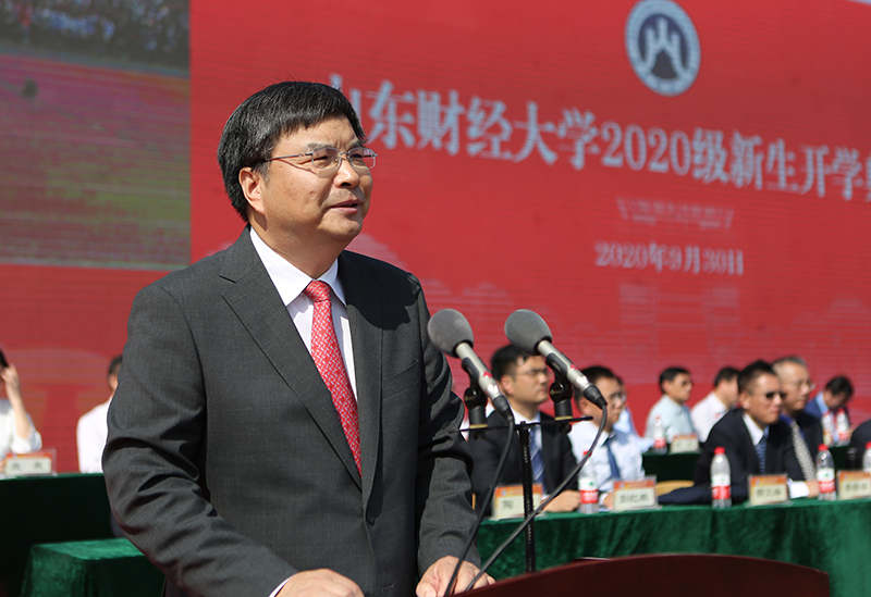 青春绽放,梦想起航;圆梦财大,再续华章。9月30日,山东财经大学2020级新生开学典礼在圣井校区田径场隆重举行。校党委书记王邵军,校长赵忠秀,党委副书记赵友春,副校长綦好东、韩作生、陈晓兰、张书学、张新,校友代表、1989级投资经济管理专业校友、招商证券山东分公司总经理李红英,教师代表、国家“有突出贡献中青年专家”、泰山学者特聘教授、第四届刘诗白经济学奖获得者、金融学院院长彭红枫等出席典礼。典礼由韩作生主持。