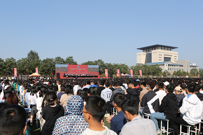 各学院和有关职能部门、教辅单位负责人以及校友代表、教师代表、在校生代表,2020级本科生辅导员,军训团全体成员,2020级本科新生参加典礼。隆重热烈的典礼,近万名新生和家长通过网络直播线上观看。