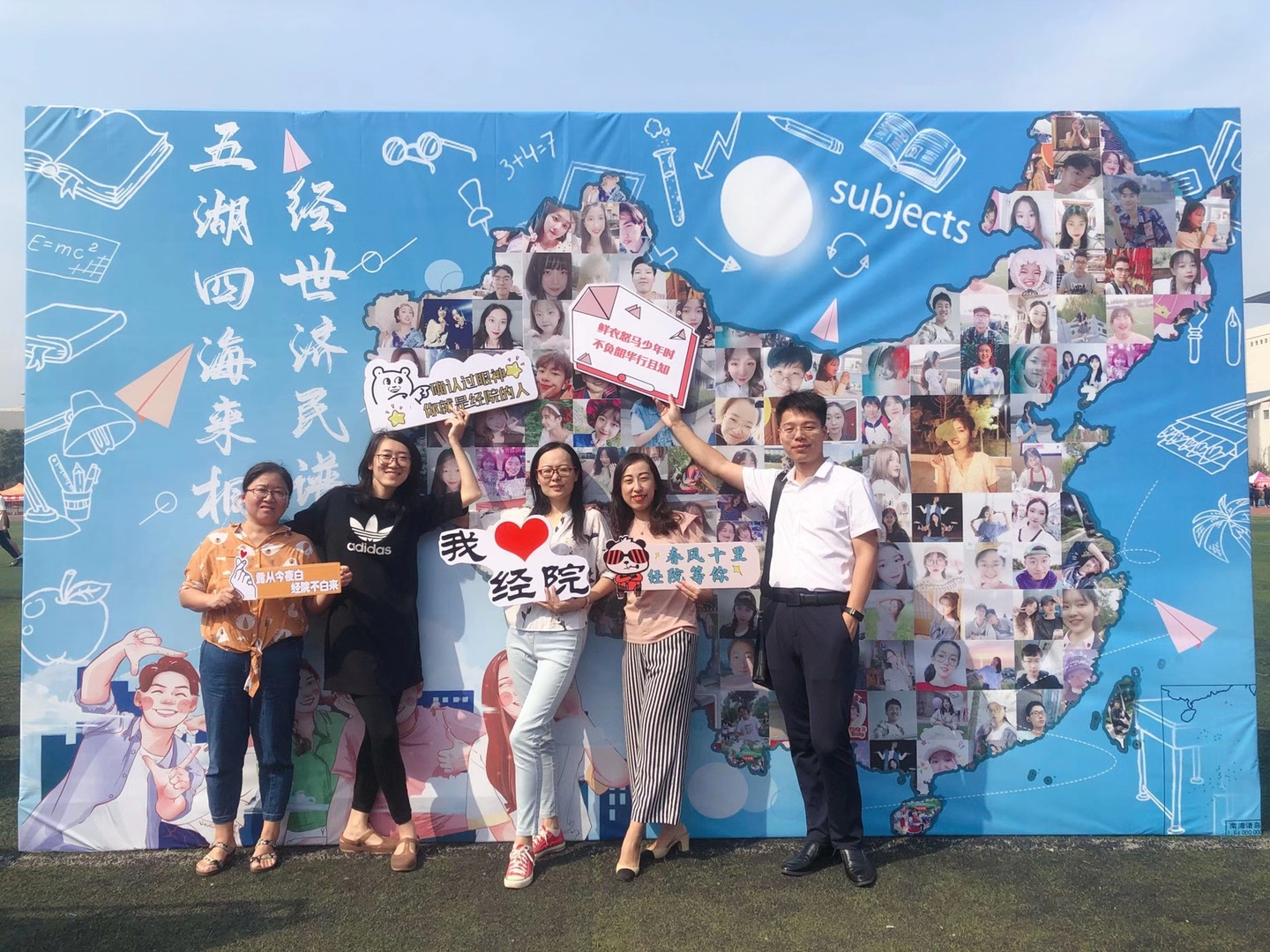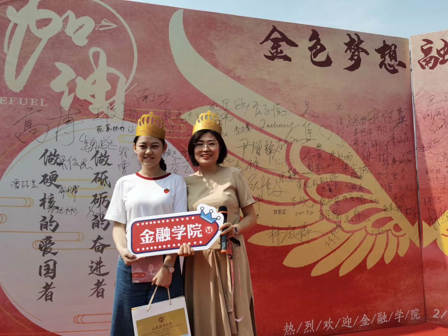 会计学院制作“梦想起航”合影墙,两扇振翅欲飞的翅膀祝愿新生乘着梦想的翅膀从财大筑梦起航;计算机科学与技术学院以院宠“财小智”为原型为新生设计制作了文创周边产品;国际教育学院通过“小小明信片,寄出梦想,放飞希望”活动让新生在开学第一天写下对未来的期许和对家人的祝福。一张张毕业生光荣榜、一面面新生签名墙,创意无限的镂空合影版,体贴周到的服务,让来自全国各地的新生梦立即融入学校、开启充满激情的校园新生活。