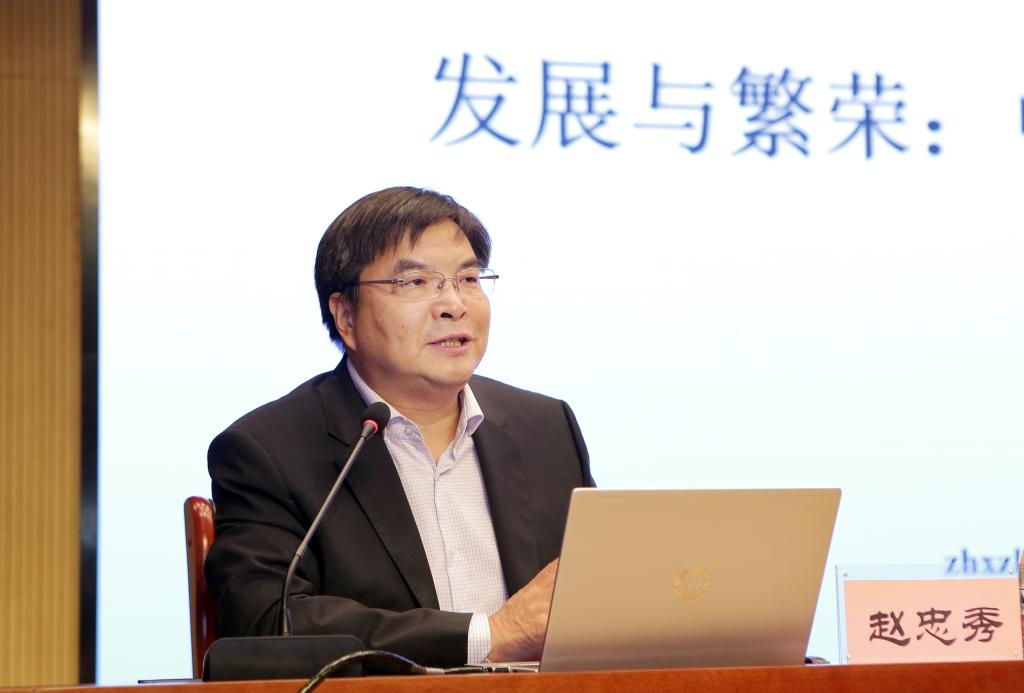10月10日下午,校长赵忠秀以《发展与繁荣:中国的道路与经验》为题,在圣井校区文化活动中心给该校区2019级新生讲授了一堂思想政治理论课,校党委副书记赵友春主持。