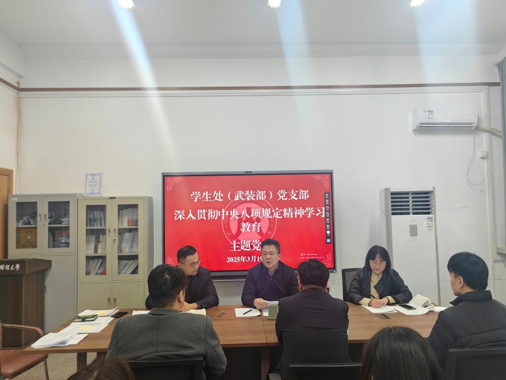 为进一步巩固深化党纪学习教育成果,3月19日下午,学生处(武装部)党支部在燕山校区1104会议室召开党员大会,正式启动深入贯彻中央八项规定精神学习教育。
