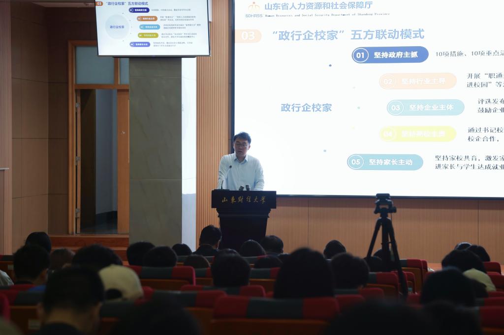 山东省公共就业和人才服务中心副主任赵鲁伟分析了当前就业形势,解读了山东省高校毕业生就业创业政策。他指出,政府通过财政补贴、税收优惠、创业扶持等多重措施,为高校毕业生就业创业提供全方位支持。希望同学们把握政策红利,实现高质量就业。济南市公共就业服务中心党委委员魏传伟聚焦本地就业市场,向毕业生推介了济南人才政策。现场还播放了《我在济南刚刚好》宣传片,展现了济南的人才发展环境。