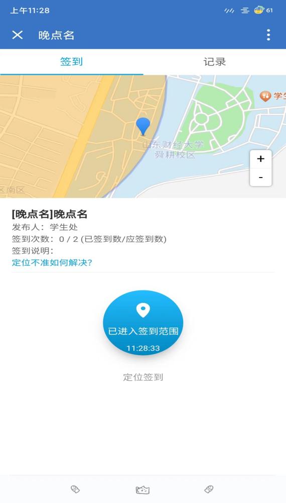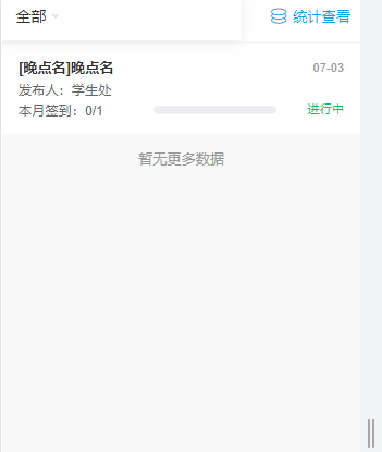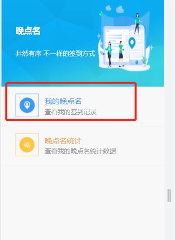 点击【晚点名统计】,可查看本人历史签到情况,默认汇总当月记录,可切换时间查看其他月份签到记录。点击签到项目可查看具体签到记录。