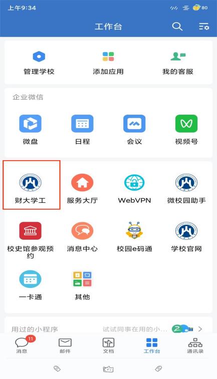 1.打开企业微信移动端进入【财大学工】系统,日常服务的功能模块下,点击所需签到的签到分类【下述以晚点名举例】,如图: