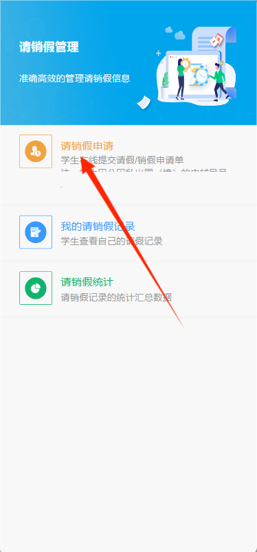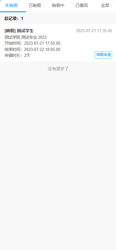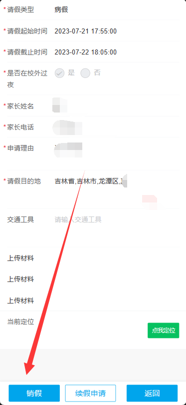 在请假截止日期前请及时销假或续假,需要销假时,点击“请销假申请”,系统会弹出待销假的请假内容,点击页面下方的销假按钮,即可发起销假。(销假发起后等待辅导员审批,审批通过才可以发起下次请假)