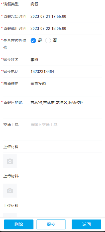 2.根据实际情况填写申请内容,如病假必须上传相关证明材料(请假3天以内,辅导员审批;3~5天,辅导员-学院副书记两级审批;五天以上请假暂不在学工系统内申请。)