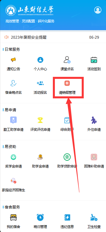 1.通过企业微信工作台,或微信通讯录,进入企业“山东财经大学”中的“财大学工”应用,点击请销假管理进入请假发起页面。