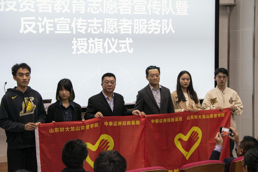 在全校“学雷锋志愿服务月”活动开展之际,3月9号下午,由山东财经大学龙山荣誉学院和中泰证券投资者教育基地共同主办的大学生金融知识普及暨防诈防非专题讲座暨共建志愿者服务队授旗仪式在圣井校区图书馆报告厅举行。中泰证券股份有限公司零售业务部总监潘嘉骊、中泰证券济南分公司纬二路营业部总经理张程、中泰证券投资者教育基地运营负责人于丽梅,山东财经大学团委书记王晓迪,山东财经大学齐鲁企业发展研究院常务副院长李鑫,山东财经大学龙山荣誉学院副院长李启航和学院2021、2022级同学现场参与活动。活动由龙山荣誉学院副院长史宏建主持。