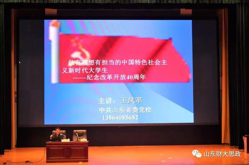 11月15日晚,中共山东省委党校一级调研员,教授,省委组织部名师特聘专家,山东省省直机关十九大精神宣讲团成员王凤军,做客嬴牟论坛第十四期暨明德论坛第七期暨成长·成才大讲堂。本次活动由学生处、商经学院、李洪星工作室共同主办。学生处处长王剑、副处长孙丽华、学院班子成员以及全体辅导员出席本次活动。学生党员、发展对象、积极分子以及2017级全体同学聆听了报告。报告由李振华主持。