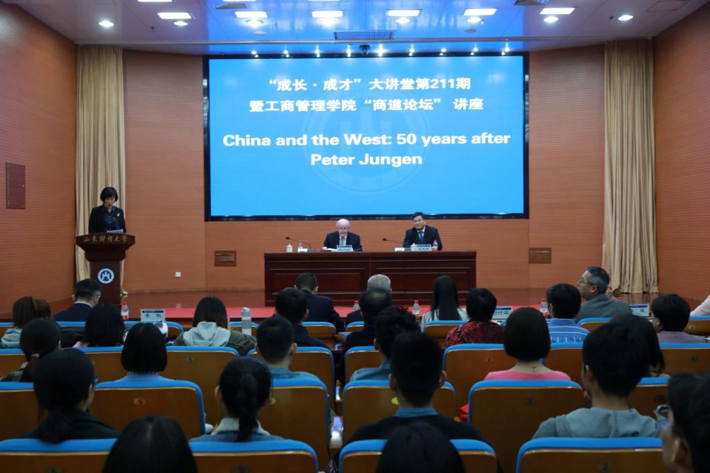 3月24日下午,山东财经大学成长成才大讲堂第211期在山财大燕山校区逸夫楼报告厅成功举行。彼得荣根控股有限公司董事长,德国天使投资联盟的创始人兼总裁、欧洲天使投资联盟联合创办人及总裁,中国天使投资联盟创始董事会成员,联邦德国“大十字”勋章获得者、欧洲天使投资联盟“总统奖”获得者彼得•荣根(Peter Jungen)以“China and the West: 50 years after”为主题,进行了精彩绝伦的演讲。校长赵忠秀以及慕名而来的400多名师生代表和各界人士参加了此次讲座。