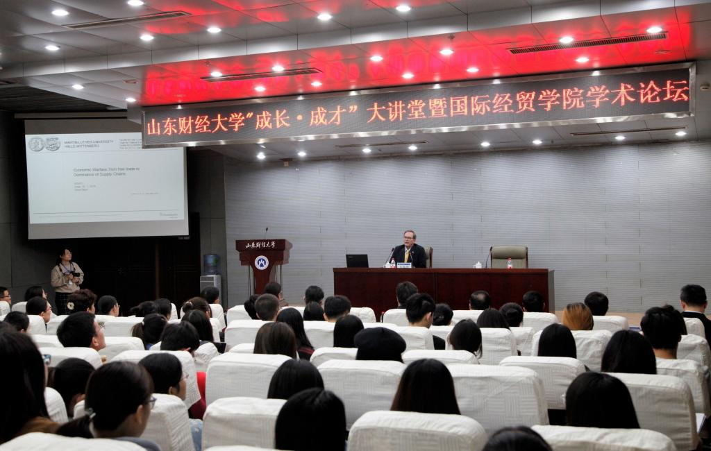 3月27日下午,山东财经大学成长成才大讲堂第212期在山财大舜耕校区举行。德国哈勒大学经济学与法学学院终身讲席教授,弗劳恩霍夫协会材料经济研究院创始院长,对外经济贸易大学客座教授,哈勒经济研究院前任院长,德国著名经济学家卜玉洗(Ulrich Blum)先生以“Economic Warfare: From Free Trade to Dominance of Supply Chains”为主题进行了一场演讲。校长赵忠秀以及学校师生代表约300人聆听了此次讲座。