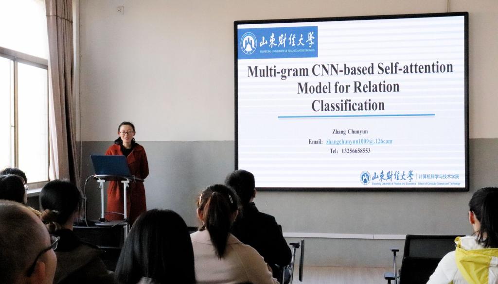 张春云老师首先为大家分享了自己近期的研究成果:关于关系分类的一篇论文《Multi-gram CNN-based Self-attention Model for Relation Classification》。在分享交流的过程中,张老师详细讲述了关于关系的分类抽取、如何有效的定位和利用关系触发特征等问题。其后冉令强老师也给大家展示了自己最近的研究成果《基于拉普拉斯坐标的网格变形研究》,讲述了基于拉普拉斯的几何纹理合成、图像放缩等研究方向。在整个交流会的过程中,同学们就自己科研路上的问题和老师的分享的内容进行了积极的沟通和交流,老师为同学们的科研工作发表了自己的看法,提供了新的科研思路。同时在会议的最后,两位老师还热心的分享了在科研路上遇到的困难以及克服困难的宝贵经验,为学生注入了对于未来的强张春云简介: