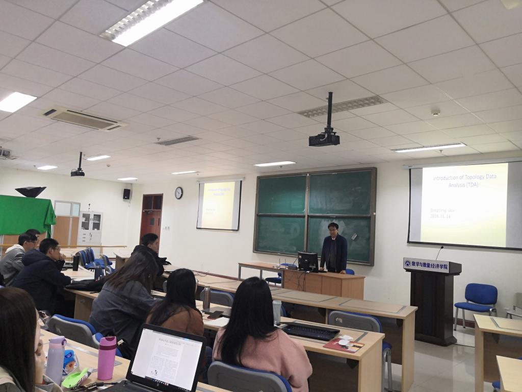 在讲座中,郭洪峰老师首先介绍了时间序列数据的典型分析方法——主成分分析、典型相关分析、聚类分析等,并就K-均值聚类法阐述了聚类思想,由此出发又介绍了目前一种基于数据点云结构的K-形聚类方法。然后,郭洪峰老师重点讲述了拓扑数据分析的发展历程,以及应用此法进行数据分析的途径,并结合金融时间序列数据进行了详细的分析。最后,郭洪峰老师进行了简单总结,并希望同学们在今后的学习与科研中,开阔思路,既要夯实基础,更要有创新思想。