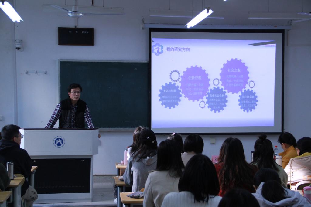 为拓宽研究生学术视野,促进朋辈交流互助,提升研究生科研实践能力,国际经贸学院于11月15日在舜耕校区2106教室举办了“话进步之道,探成长之路”青年学者讲座专项活动。活动邀请了国贸学院贸易经济教研室主任刘鲁浩副教授为主讲老师,研究生辅导员滕晖老师和2019级全体研究生参加了此次活动。