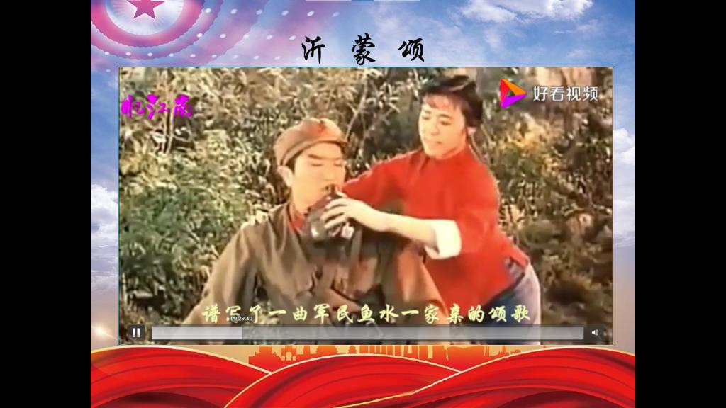 接着,梅老师又向同学们介绍了一部芭蕾舞剧《沂蒙颂》,在解放战争时期,沂蒙山有一群伟大的母性群体,她们无私奉献,救死扶伤,为战士们送军鞋、缝军衣、抬担架,‘军民一家亲’在她们的身上体现得淋漓尽致。同学们正襟危坐,目不斜视,在经典的黑白影片和动人的歌声中感受解放战争时期中华儿女强烈的爱国情怀。红色经典乐曲凝聚着中华民族由危亡走向新生继而迈向辉煌的厚重历史。从解放时期的红歌中我们可以知道,中国共产党的胜利是民心所向,没有哪一支军队像中国共产党领导的军队那样身后有如此雄厚的群众力量。