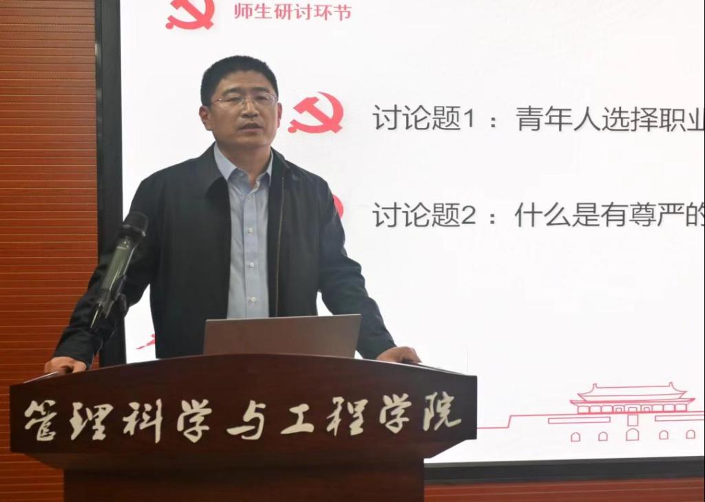 活动分为宣讲和研讨两个阶段。在宣讲阶段,来自信外2202奚瑞祺、大数据2201魏熙桐和电商2302刘琦睿三位同学就各自在两期读书活动中所读到的马克思的《青年人在选择职业时的考虑》和毛泽东的《七绝·改诗赠父亲》两则名篇,分享了自己在追寻伟人成长心路时发出的共鸣和在探寻伟人职业选择之路时获得的启发。更具有意义的是,在表达了这些共鸣和启发之后,他们结合各自专业背景,深入思考了自己的职业理想和发展路径,同时,也提出了诸如“什么是有意义的工作”“坚守和选择是否矛盾”等反应青年心声、戳中青年痛楚的疑问。
