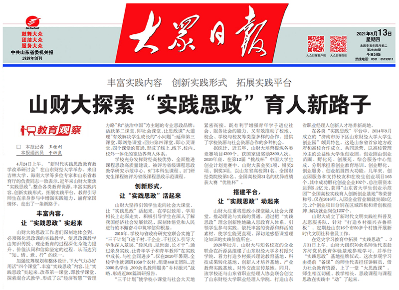 □ 本报记者 王桂利 本报通讯员 于洪良 4月24日上午,“新时代实践思政教育教学改革研讨会”在山东财经大学举办。来自吉林大学、海南大学等多位专家和山东省教育厅的负责同志一致表示,近年来山财大聚焦“实践思政”,整合各类教育资源,丰富实践内容,创新实践形式,拓展实践平台,教育引导师生在亲身参与中增强实践能力、涵育家国情怀,走出了一条新路子。 丰富内容,让“实践思政”实起来 山财大的思政工作者们深刻地体会到,必须强化思政课的实践教学,使思政课教学由知识传授、理论教育的过程深化为能力提升、价值认同和信仰坚定的过程,从而达到“知、情、意、行”的统一。 加强统筹规划和整体设计,下大气力办好用活“四个课堂”,丰富“实践思政”内容,让“实践思政”实起来。改革第一课堂,即教学课堂,探索混合式教学,形成了以“经济智慧”“管理方略”和“法治中国”为主题的专业思政品牌;活跃第二课堂,即社会课堂,让思政课“大道理”有效解决学生成长的“小问题”;延伸第三课堂,即网络课堂;回归第四课堂,即心灵课堂。四个课堂的贯通,形成了线上、线下、校内、校外一体化的宽边界育人体系。 学校充分发挥财经高校优势,全面推进课程思政高质量建设,被评为省级课程思政教学研究示范中心,9门本科生课程、2门研究生课程被评为省级课程思政示范课程。 创新形式,让“实践思政”活起来 山财大坚持引领学生走向社会大课堂,让“实践思政”活起来,在学以致用、学用相长上走深走实,积极引导学生在深入了解我国经济社会发展状况、深刻体悟党和人民进行的不懈奋斗中筑牢信仰根基。 2015年,学校与省政府研究室联合实施了“三千计划”(进千村、千企业、千社区),引导大学生深入基层,“经风雨、见世面、长才干”。通过亲身实践,让青年学子和青年教师“在实践中成长,与社会同进步”。仅在2020年暑期,全校学生就调研1058个农村,组建448支团队,近3000名学生、200余名教师服务“乡村振兴”战略,形成近500篇调研报告。 “三千计划”使学校小课堂与社会大天地紧密衔接,既有利于增强青年学子适应社会、服务社会的能力,又有效推动了校地、校企、学校与校友等类型多样的合作,提供了学校资源与社会资源合作的多种机会。 据统计,近五年,山财大培育提炼各类竞赛项目4300个,获国家级奖励3800人次。2020年底,在第12届“挑战杯”中国大学生创业计划竞赛中,山财大获金奖1项、银奖2项、铜奖3项,以山东省高校第1名、全国财经类院校第1名、全国高校第31名的优异成绩获大赛“优胜杯”。 搭建平台,让“实践思政”动起来 山财大注重将思政小课堂融入社会大课堂,推动理论与实践的贯通。通过把“实践思政”理念创新性地融入思政育人体系,引领学生参与实践,依托丰富的资源和鲜活的素材,使学生能更直观、深切地感悟课堂理论知识的实践价值所在。 2020年12月,山财大与知名校友的企业联合在沂源县组建了山东财经大学乡村振兴学院,着力打造乡村振兴理论教育基地、科技成果转化基地、创新人才培养基地、产业教育实践基地、对外交流宣传基地。同月,该学校还与山东省职业经理人协会联合创立了山东财经大学职业经理人学院,打造山东省职业经理人创新人才培养新高地。 在各类“实践思政”平台中,2014年9月成立的“济南市历下区山东财经大学大学生创业园”颇具特色。这是山东省首家地方政府和高校合作成立,共同运营,以高校管理为主的公益性大学生创业园。创业园由创业苗圃、孵化苑、创展苑、综合服务中心组成,分别承担着创业教育培训、创业孵化、创业服务、创业拓展四大功能。几年来,创业园服务和支持校友和在校生创业项目165个,其中成功孵化创业企业102个,总注册资本达到5.2亿元,获得“山东省大学生创业示范园”“全国高校实践育人创新创业基地”等荣誉称号。仅在2016年,入园企业营业额就突破1亿元,2个创业项目分别在区域四板和青创板挂牌,解决就业岗位1237个。 山财大成立了新时代文明实践社科普及志愿服务队,针对“打造乡村振兴齐鲁样板”,定期赴山东16个市50多个村镇开展新时代文明社科普及工作。 在党史学习教育中拓展“实践思政”。3月31日上午,山财大组织70余名师生代表赴齐河党员教育体验基地参观学习,并举行“实践思政”基地挂牌仪式。这次参观学习由提前“备课”的师生代表担任讲解员,借力社会教育资源,上了一堂“大思政课”。师生相互切磋、教学相长,思政课程与课程思政在实践中“动”了起来。 阅读链接:http://paper.dzwww.com/dzrb/content/20210513/Articel21002MT.htm |
