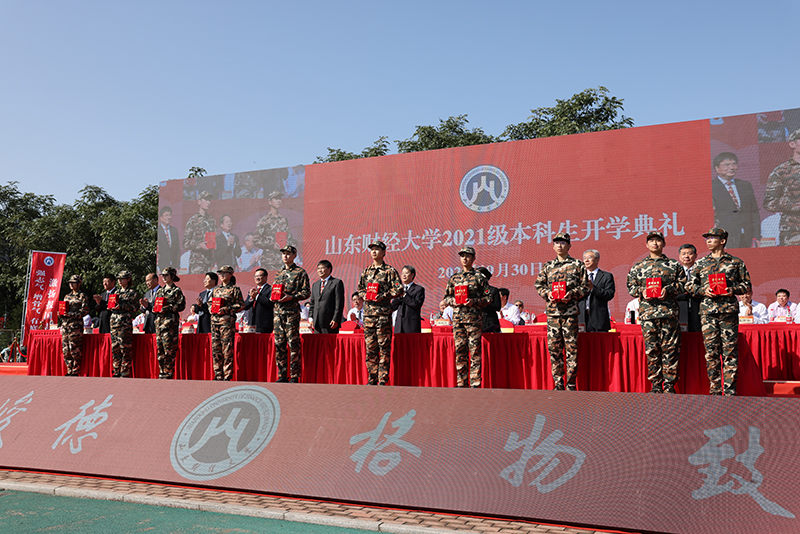 上午9:30,全体起立,升国旗、唱国歌。升旗仪式之后,山东财经大学2021级新生开学典礼正式开始。