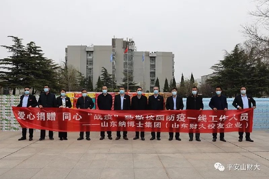 3月24日,山东财经大学校友企业山东纳博士集团向母校疫情防控一线安保工作人员捐赠物资,表达对母校培养的感恩之情。山东财经大学副校长张培国出席捐赠仪式,感谢校友企业对母校疫情防控工作的支持。党委保卫部、合作发展处、振邦保安公司负责人参加了捐赠仪式。