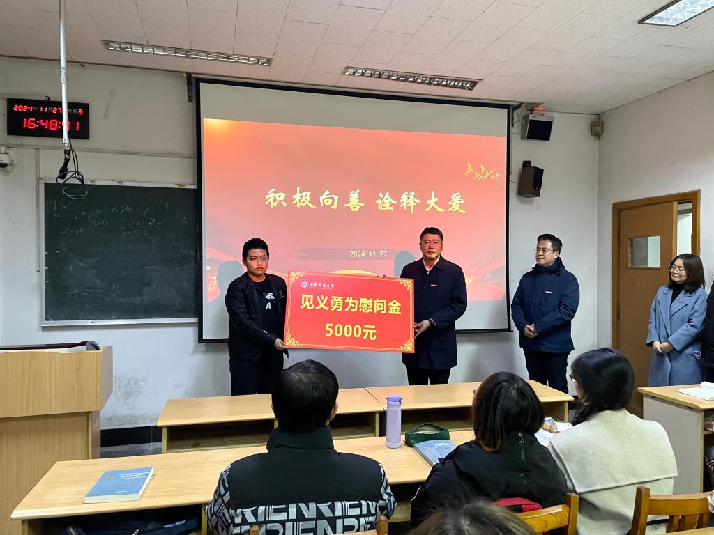 刘旻航代表学校为闫建松颁发慰问金;杨哲为闫建松送上慰问品。