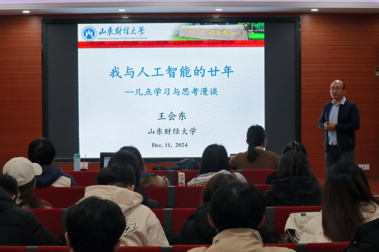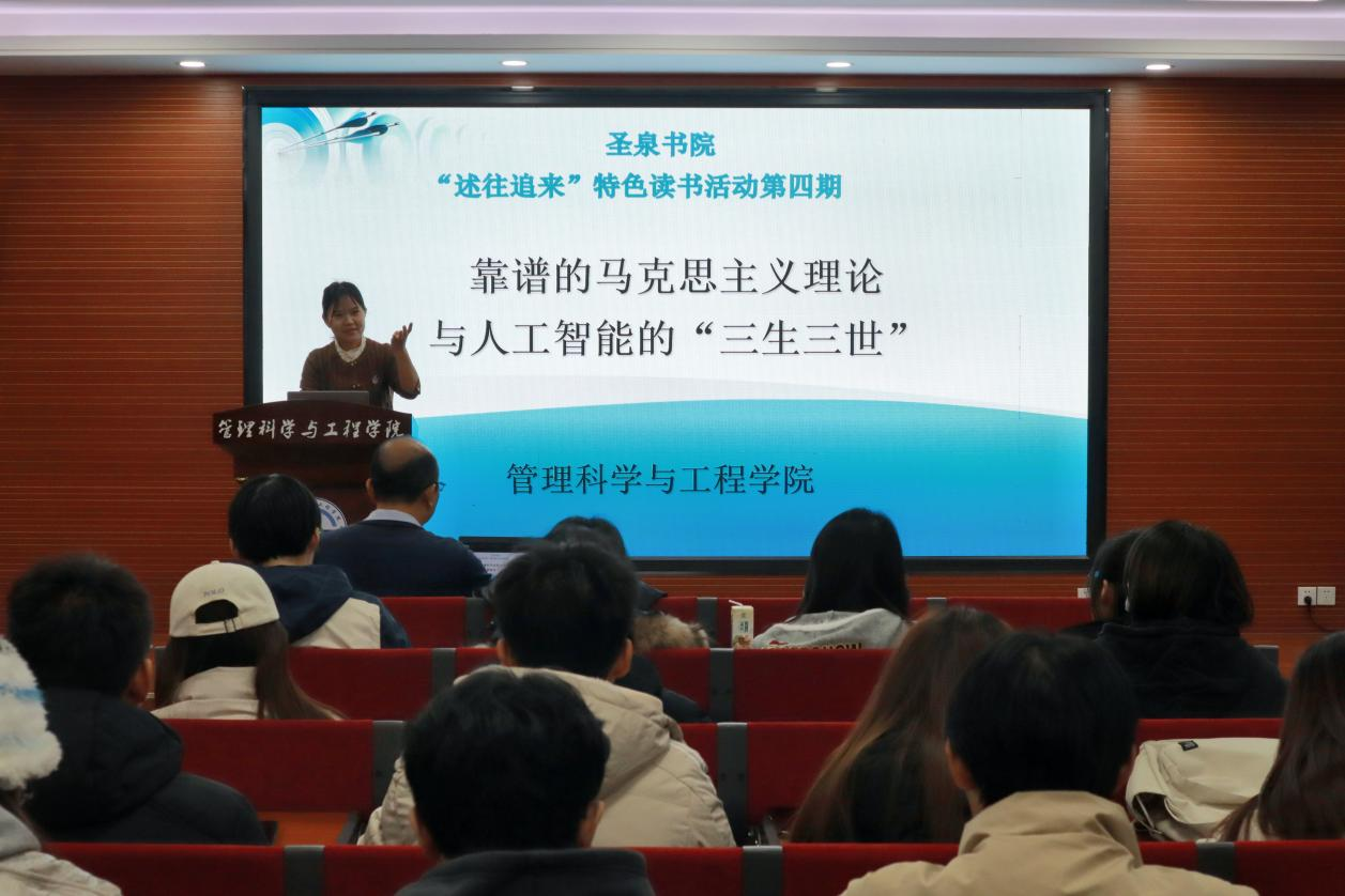 2024年12月11日,第四期“述往追来”特色读书会在山东财经大学圣井校区6432会议室举办。本次活动主题为《马克思主义理论与人工智能的“三生三世”》,两位领读人分别为管理科学与工程学院大数据管理与应用系党支部书记、系副主任王会东教授,学生第四党支部书记、“多触角两栖式”辅导员素质能力提升工作室主持人冯婧老师。大数据管理与应用专业2022级、2023级、2024级近六十名同学参加了本次读书活动。