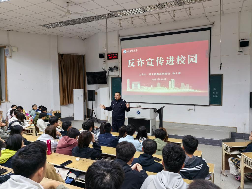 为切实提升新生反诈意识和识骗防骗能力,有效遏制校园电信网络诈骗案件高发态势,10月17日晚,反诈宣传教育进校园专题宣讲在舜耕校区举行,舜玉路派出所所长孙全修警官担任宣讲嘉宾,活动由学生工作处副处长周广春主持。