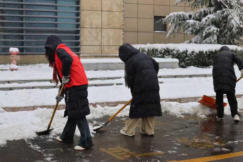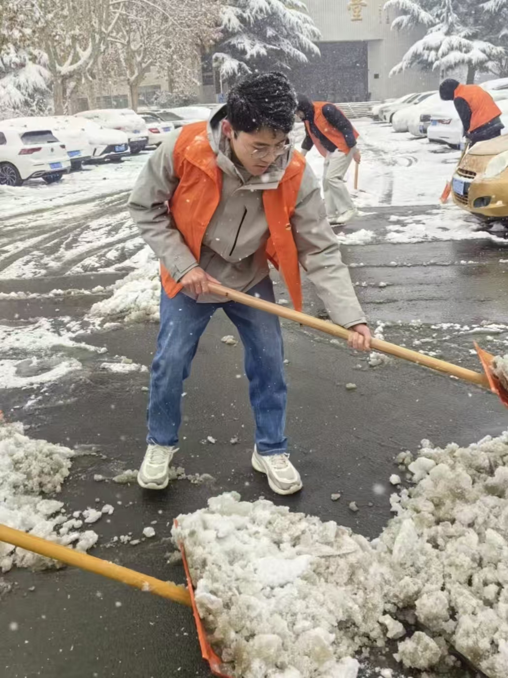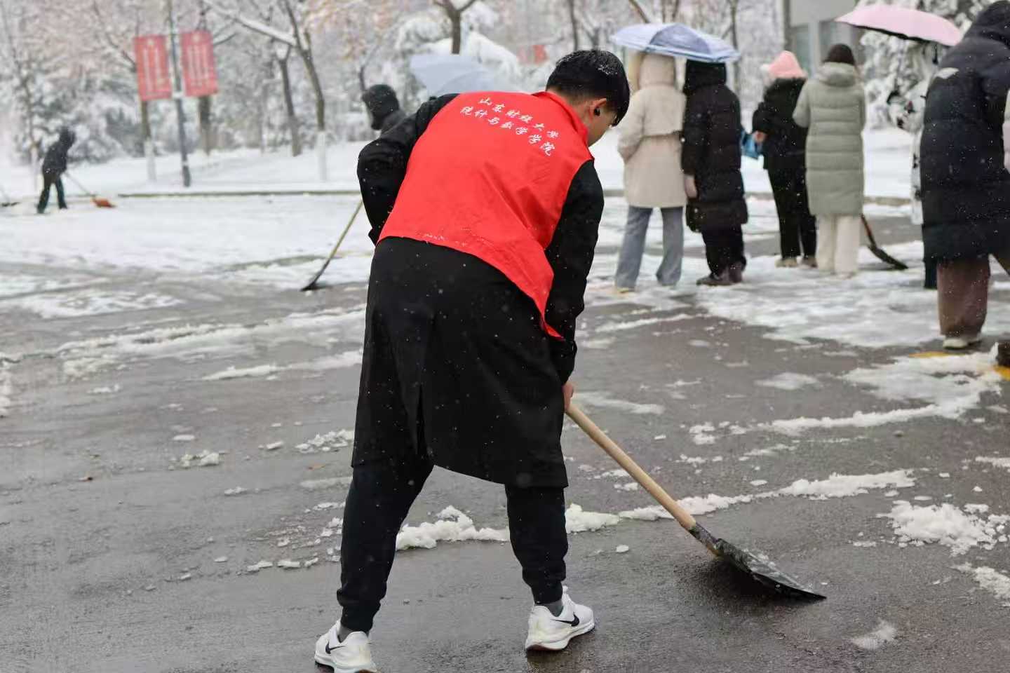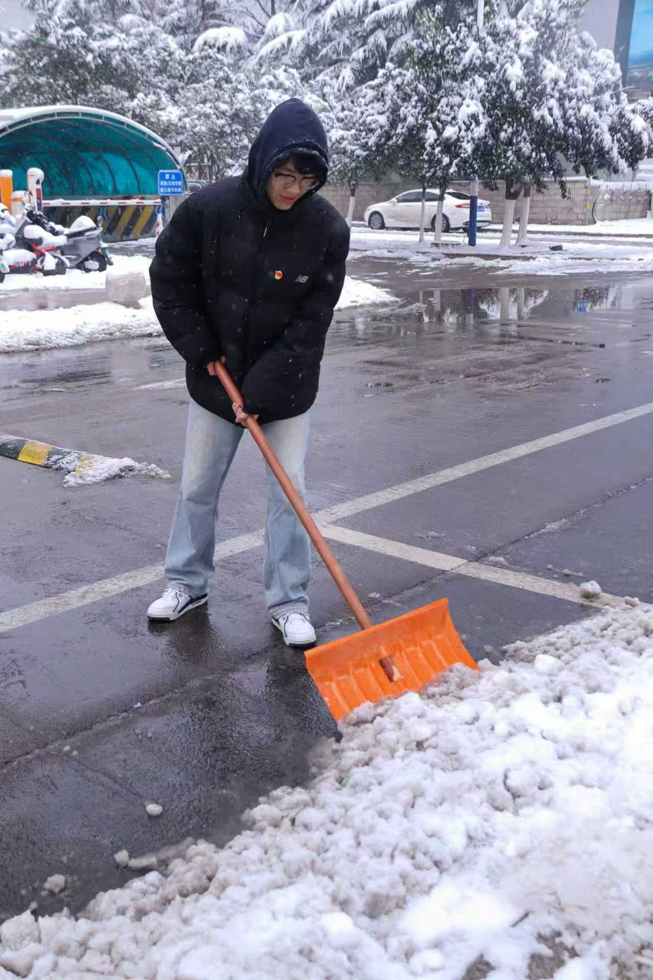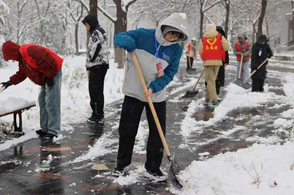 从宿舍楼前到教学楼台阶,从图书馆广场到校园路口,师生携手并肩、分工协作,挥锹破冰时的铿锵声响,推铲积雪时的默契配合,让忙碌的身影成为风雪中最温暖动人的风景线。凛冽寒风挡不住劳动的热情,额头渗出的汗珠驱散了冬日的寒意,这场实践更是一堂生动的劳动教育课,在言传身教中厚植奉献精神,传递责任担当,让劳动之美在校园各处熠熠生辉。