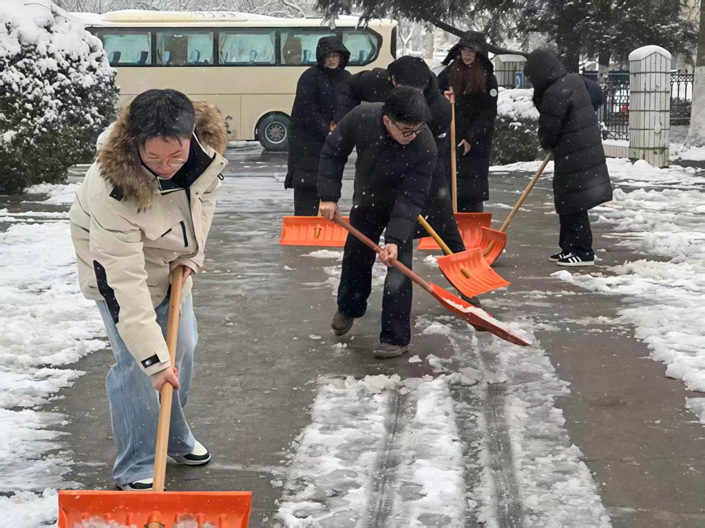 雪情即是命令,行动诠释担当。为确保校园道路畅通,保障师生出行安全,学校提前部署,各学院积极响应,迅速启动扫雪除冰应急预案。天刚破晓,一支由辅导员、学生党员、学生干部与志愿者组成的扫雪队伍已在寒风中集结。他们手持铁锹、扫帚,奔赴各校区公寓楼、教学楼、图书馆周边及主干道等重点区域,展开了一场热火朝天的扫雪除冰行动。