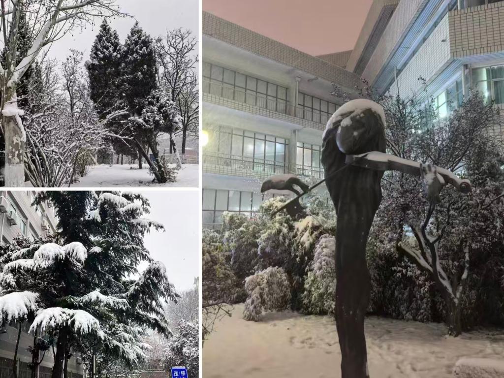12月12日,今冬的初雪如期而至。纷扬的雪花轻轻覆盖山东财经大学章丘、燕山、舜耕三大校区,将校园装点得如诗如画——楼宇静默披银装,枝头低垂挂琼芳。雪景虽美,却也悄然在路面凝结成冰,为师生出行埋下了安全隐患。