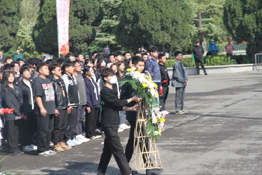 悼念仪式开始,全体肃立,奏唱中华人民共和国国歌,升国旗,全体人员行注目礼。激昂的国歌在同学们耳边奏响,鲜艳的五星红旗迎风飘扬,一篇篇为国为民的革命故事,一幅幅充满艰辛奋斗的岁月图片,回应在同学们的脑海中。全体人员向墓碑鞠躬,弯腰行礼。最后,学院向烈士献花缅怀。
