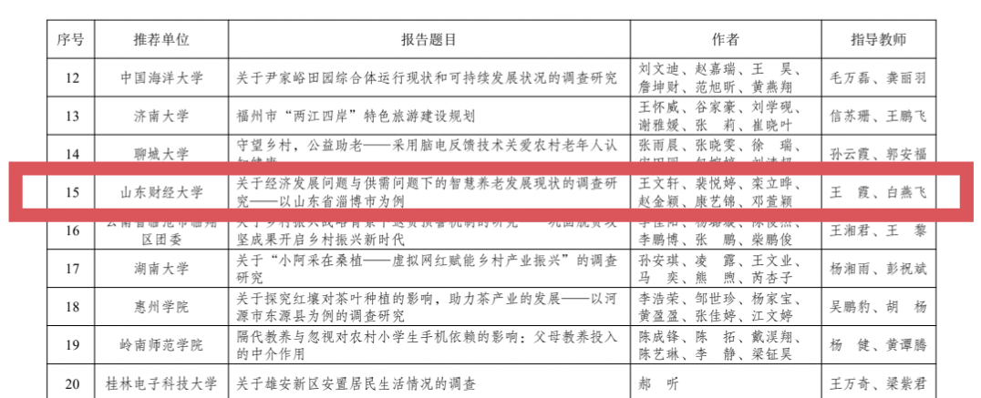 近日,共青团中央2022年“三下乡”“返家乡”社会实践优秀调研报告入围名单公布,我校保险学院“淄智养老”——精准化养老背景下山东省淄博市智慧养老调研团队的《关于经济发展问题与供需问题下的智慧养老发展现状的调查研究——以山东省淄博市为例》调研报告获评优秀调研报告,这是我校唯一一个入围的团队调研报告,按照专家评分由高到低位列全国第15名。