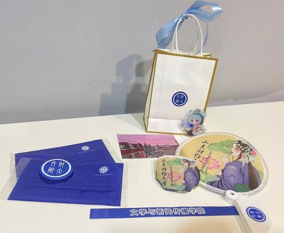 腕带徽章口罩:为配合疫情防控,大家仍然要做好个人防护,学院贴心地为大家准备了带有象征学院标志的口罩,以蓝色为底,点缀着文学与新闻传播学院的文字与标志,简约大气又不失创意。在如今的疫情防控工作下,戴上口罩,接受这份学院限定的温暖。徽章与腕带采用同款设计,相互映衬,观赏性与实用性同时具备。