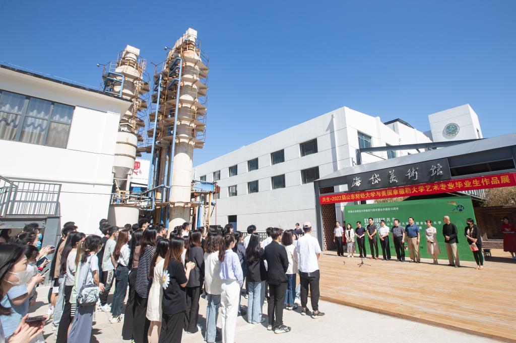 副校长张书学在致辞中表示,今年的毕业作品展不仅首次在海岱美术馆盛大开幕,更有我校的国际合作高校,美国拿撒勒大学的16件作品联袂参展,完美诠释了艺术创作跨越国界、超越时空的无穷魅力。2022年的毕业季是非常特殊的一季,同学们的多数时间被封闭在校园内,防疫抗疫让大家经受了历练,收获了成长;再过10天,我们将迎来建校70周年暨合并建校10周年庆典,下半年我们更会欣喜地迎来中共二十大的胜利召开。近年来,艺术学院坚持“艺术+财经”的特色发展模式,始终坚持“求其真、明以德、游于艺”的教育理念,不断提高教育教学质量,赢得了很高的社会声誉,招生分数和生源质量不断提升,实践证明,除了课堂上的理论传授之外,实景写生、作品拍卖、艺术调研、专业实习、课程国际化等实践类课程,对艺术专业的人才的培养至关重要。他希望艺术学院科学统筹,充分发挥美术馆在教学、会展、陈列、实践、交流等方面的功能,不断提高育人质量,为学校争创双一流财经特色名校做出积极贡献。