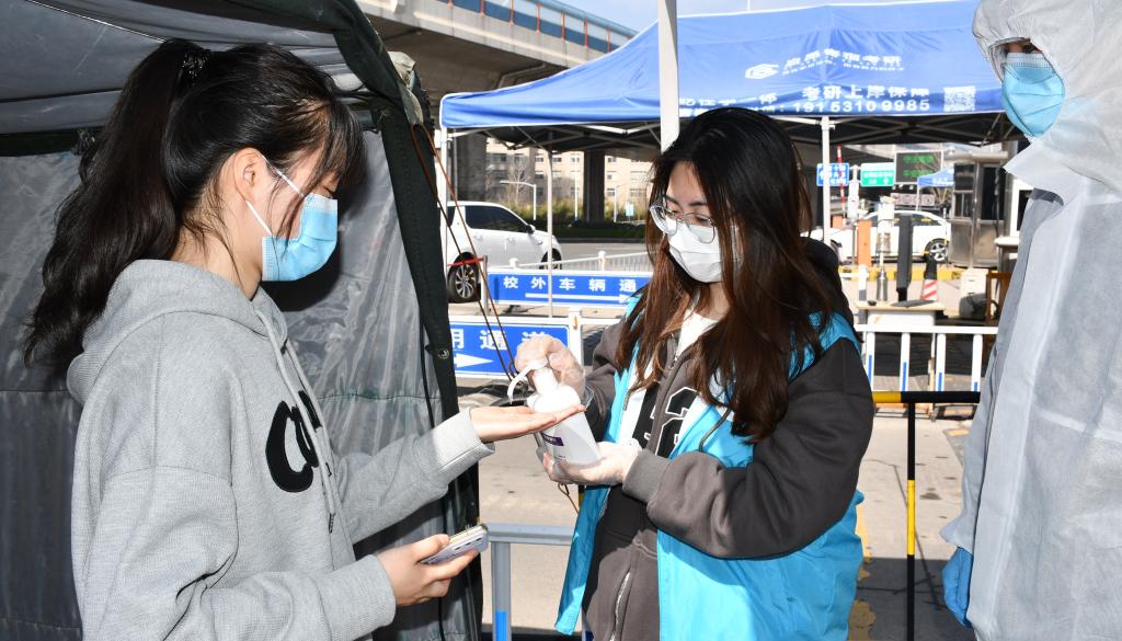 学生入校时在校门口有序排队,人与人之间相隔1米以上,逐一通过检查点和测温点。由学校安保人员对进校学生进行体温检测,学生等待期间不走动,不交流,准备好身份证、学生证、《返校回执》等证件。若检测中发现一名同学体温超过37.3℃,立即引导该生前往临时观察点等候,并由其他同学立即上报辅导员。辅导员第一时间到达现场,安抚学生情绪并向学院领导汇报相关情况,同时联系校医院相关负责人。将出现异常情况的学生送去定点医院诊治后,立即对临时隔离点进行消杀处理,并对该生周围5米内一同排队等候入校的学生进行信息登记。
