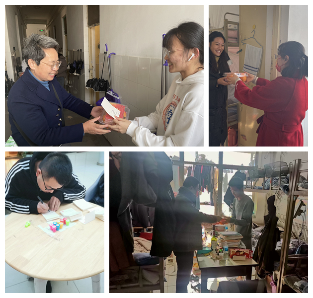 老师们来到学生公寓一边派送惊喜礼盒,一边详细询问毕业生们的复习备考情况、求职就业情况和未来规划等,嘱咐同学们在备考冲刺阶段,要注意劳逸结合,要以最饱满的状态参加考试,同时更要注意身体健康,保持积极放松的心态,迈好走向社会的第一步。