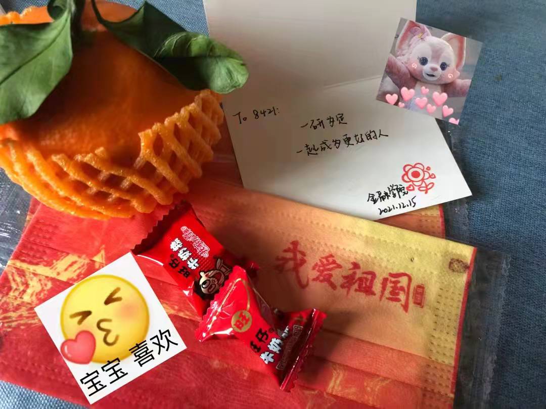 2018级金融学6班的吴长雨同学说道,“中午在宿舍收到了金院老师们的温温暖暖,十分感动,我们定会调整心态,认真备考,不辜负学院的期望”。“感谢学院和老师们送的温暖和祝福,未来的日子里我们定要加倍努力向前冲!”2018级金融工程4班高秀慈激动地说。当晚,收到学院贺卡、橙子、糖果等成为学生朋友圈的“网红”,大家高呼金融学院“YYDS”,纷纷表示毕业季很苦,但学院关怀很甜,能够收到学院的关怀,确实很高兴。