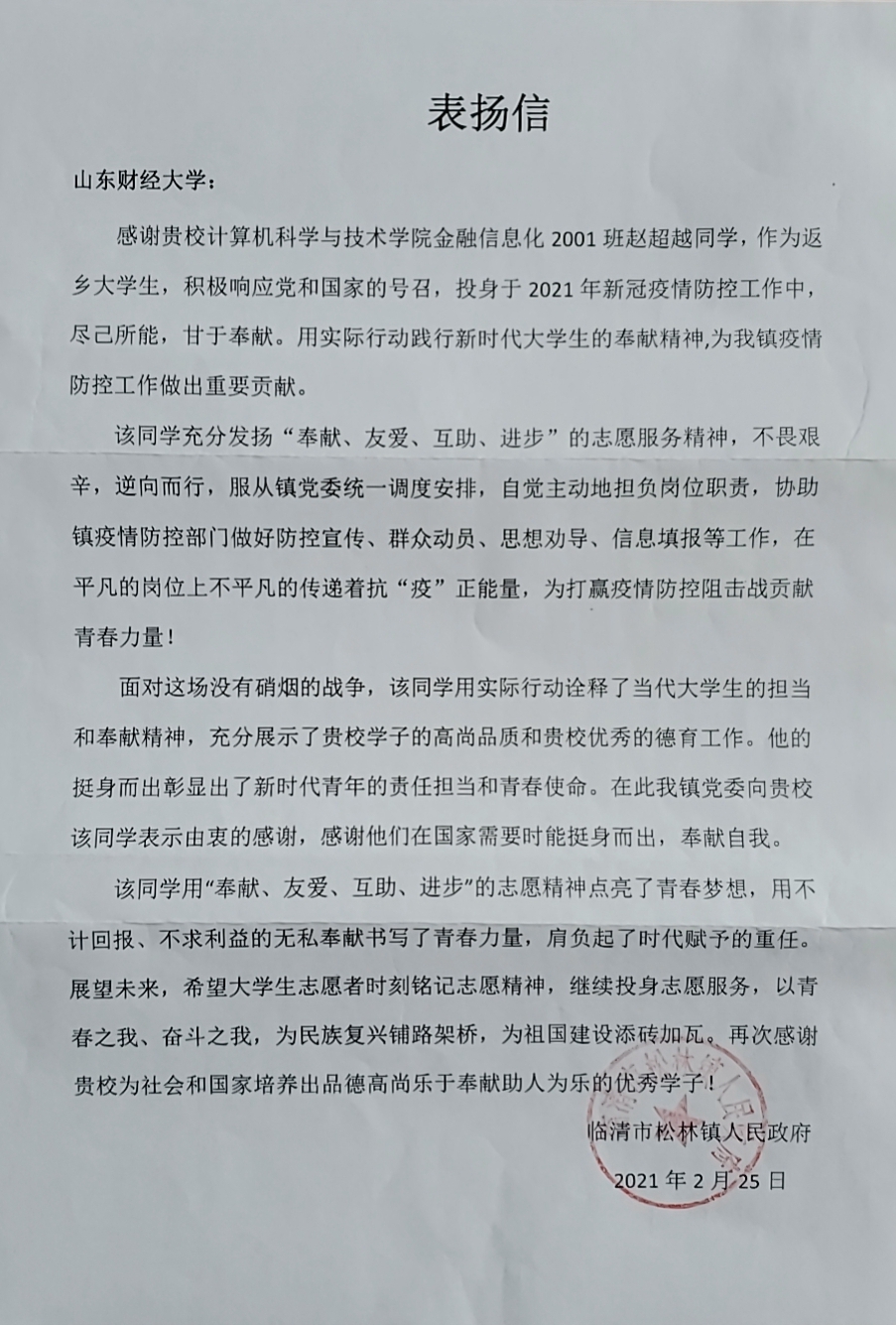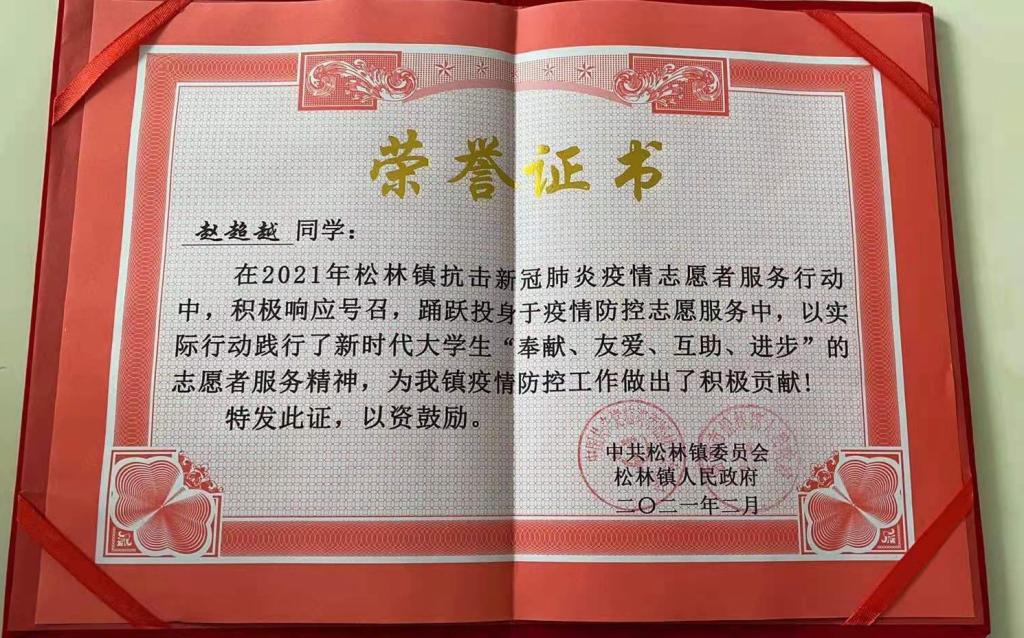 我校计算机科学与技术学院2020级计算机科学与技术金融信息化一班赵超越同学,作为一名新时代优秀大学生,响应家乡党委政府号召,利用寒假期间积极承担社会责任,主动投身于家乡的疫情防控工作之中,受到当地政府表彰。