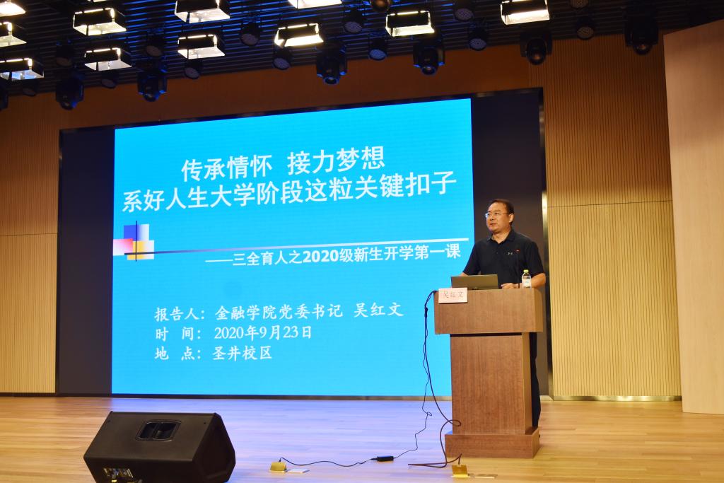 为帮助新同学全面适应大学生活,做好思想政治教育工作,9月23日晚金融学院党委书记吴红文在圣井校区文化活动中心多功能厅举办以“传承情怀,接力梦想,系好人生大学阶段这粒关键扣子”为题的新生报告会。2020级全体新生现场聆听报告。