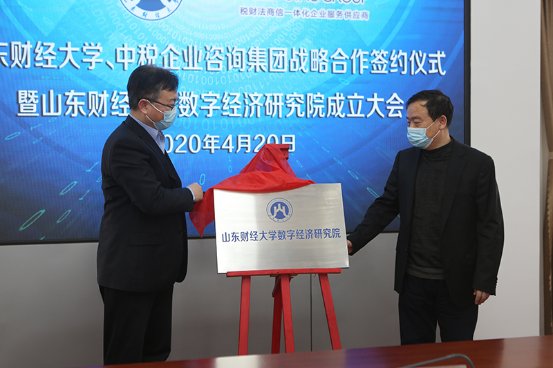 王邵军、宋宁为研究院揭牌。王邵军为宋宁颁发兼职教授聘书,为研究院院长、金融学院教授黄方亮,执行院长宋宁,副院长、财政税务学院教授郭健,副院长、管理科学与工程学院副教授王高山颁发聘书。合作发展处处长、校友工作办公室主任刘奇耀与中税企业咨询集团副总裁兼山东区域总经理、89级国民经济计划专业校友王为光代表双方签署协议。