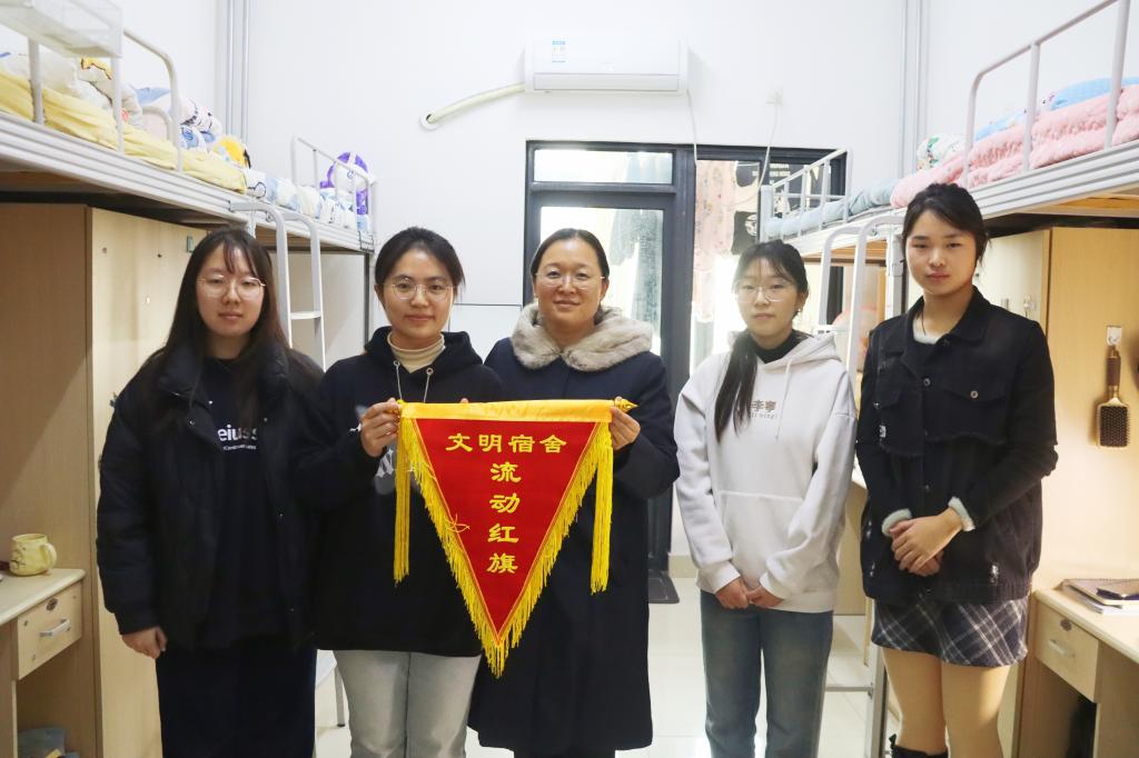 24日,学院党委副书记陶晓华在学院圣井校区学生宿舍检查,并为入党积极分子文明宿舍颁发流动红旗,表彰其在安全管理、卫生环境等方面的出色表现,营造文明、和谐、向上的宿舍氛围。