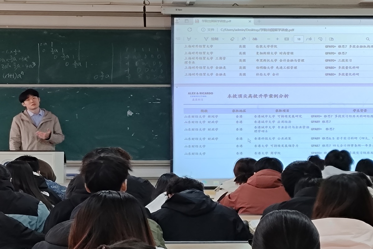 3月27日下午,计算机与人工智能学院在章丘校区举办“山财学子留学顶尖高校及求职规划”专题讲座。活动特邀嘉晨教育合伙人李飞宇讲师担任主讲,辅导员李珊珊主持。