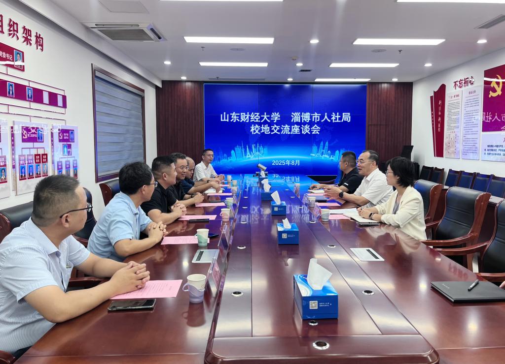 随后,学院一行前往淄博市公共就业和人才服务中心开展交流活动,淄博市公共就业和人才服务中心党委委员、副主任崔向军,人才服务一科科长卢诺,副科长焦广志,山东大地人律师事务所合伙人、93物资经济专业校友黄保学,山东新沃欧途教育咨询服务有限公司董事总经理、97级市场营销专业校友李运秋,长江证券淄博分公司业务经理、10级工商管理专业校友张守恒参加座谈会。崔向军详细介绍了淄博市经济社会发展概况、产业布局及人才政策优势,特别用数据展示了近两年我校毕业生在淄就业情况。他表示,期待通过校地合作吸引更多优秀学子来淄发展,共建共享的良好合作态势。赵世民介绍了我校及学院的办学特色及人才培养成果、就业工作等情况。他指出,建议双方建立长效联络机制,深化人才招聘,发挥各自优势,多渠道、新形式宣传招才引智政策,拓宽大学生的就业渠道,为有意向来淄就业创业的大学生做好联系、协调和服务工作。双方在人才培养、实习就业、课题研究等方面达成合作意向。