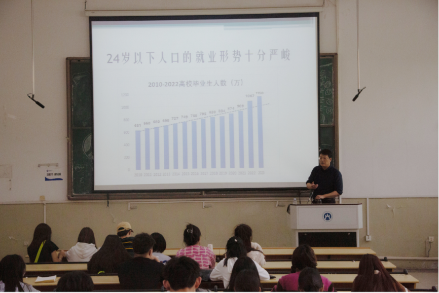 何老师从多个方面分析了当前社会背景下高校毕业生的就业形势。首先,他用数据向同学们展示了近几年就业率的真实情况,谈及24岁以下人口就业形势之严峻,何老师建议同学们在学习之余,要主动了解当前的就业政策,并且根据变化及时调整自身发展方向。
