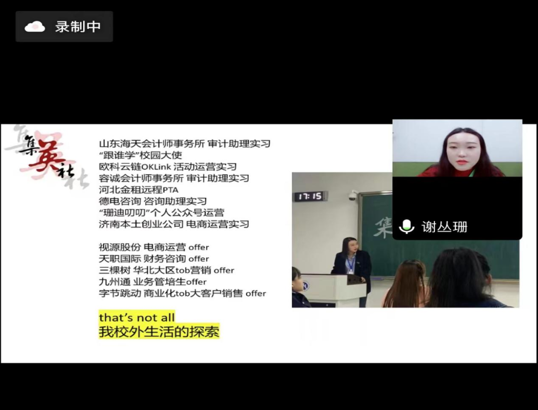 3月14日(周二)晚19:00,由就业指导处主办,会计学院承办的就业指导讲座第21期通过腾讯会议方式线上举行。讲座邀请了23届毕业生谢丛珊,她从自身经历出发,为大家分享她的大学生活与职业规划,讲座由会计学院就业办主任孙菁主持。
