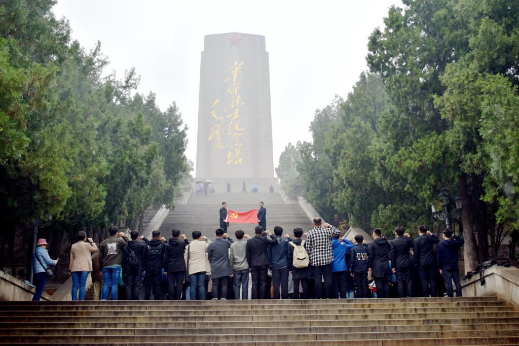 全体人员在赤霞广场准时集合,在范书记和李老师的带领下,来到了庄重肃穆的毛主席雕像前,绵绵细雨似乎更加衬托了师生的缅怀之情,大家拾阶而上,来到烈士纪念塔下,面对伟人雕像,全体党员整齐列队静默肃立,心怀敬意地瞻仰毛泽东塑像,依次向前鞠躬并献上花束,以表达对毛主席的崇高敬意和哀思之情。烈士纪念塔矗立在山顶,默然守护着城市,整个塔身在两旁苍翠遒劲的松柏掩映之下更添几分庄重肃穆,毛泽东同志题写的“革命烈士纪念塔”七个镏金大字愈加耀眼。66名新接收的预备党员在纪念塔下列队静默肃立,表达对革命英烈的缅怀之情,并面向党旗进行了庄严的入党宣誓。全体新党员向着英烈,用充满朝气和坚定的声音许下为共产主义奋斗终身的铮铮誓言,每个字都铿锵有力,发自肺腑。前行不忘来时路,初心不改梦归处,这庄重誓言从此成为全体新党员的无悔承诺。